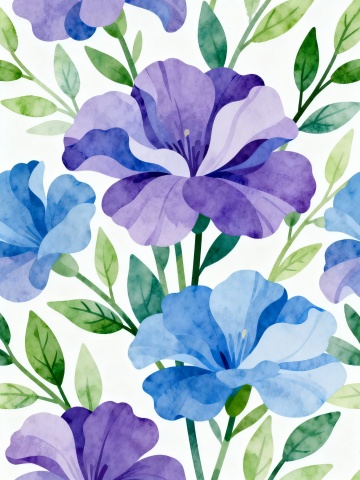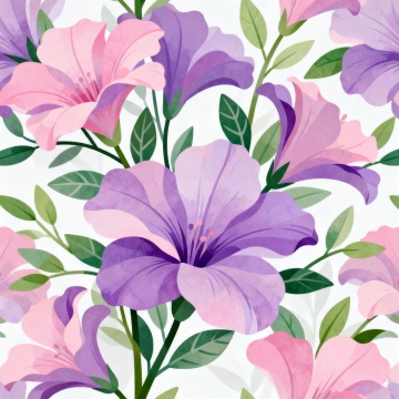 水彩风格花卉装饰图案,以淡紫色和深紫色为主色调,保留原有的水彩透明晕染质感和柔和的笔触效果,画面中散落大小不一的紫色花朵和花瓣,部分花瓣带有渐变色彩,整体构图呈现自然的散射状分布,背景为纯白色,营造出轻盈、浪漫的氛围,所有花卉元素保持原有的形态特征和空间分布关系,无文字及二维码等元素。