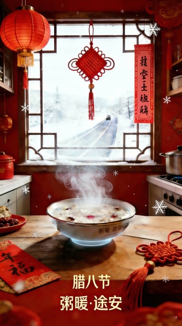 国潮风融合重拟物与鎏金浮雕,红金主色营造喜庆奢华氛围,腊八粥热气氤氲,搭配中国结与灯笼,尽显中式复古年味。