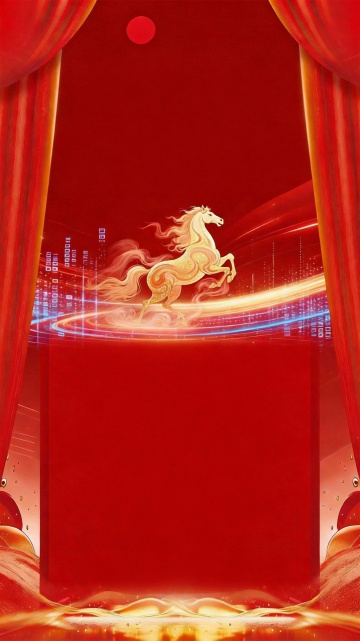 中式复古风海报,红金配色尽显喜庆与奢华,重拟物浮雕马踏祥云,搭配灯笼与中国结,国潮金属质感浓厚,节日氛围浓郁。