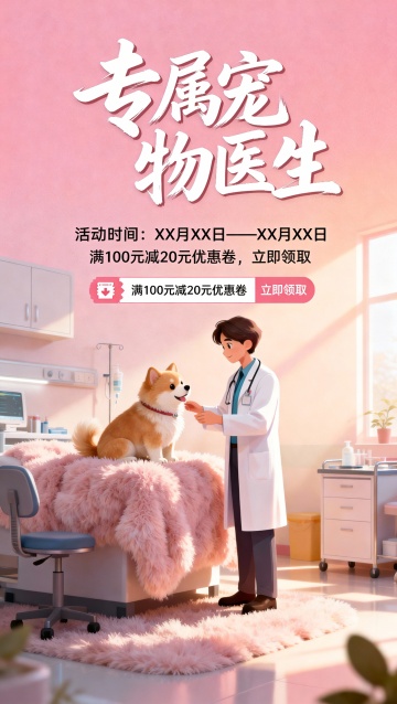 插画风结合轻拟物设计,营造温馨甜蜜的宠物诊疗场景,卡通感十足,柔和色调传递舒适安心氛围,虚拟现实感增强沉浸体验。