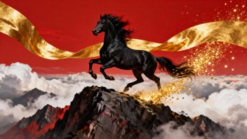 黑骏马踏云凌空,鎏金飘带与粒子飞舞。