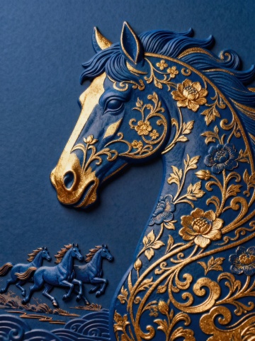 鎏金黑马跃然于古典纹饰之中,融合3D浮雕与重拟物风,极繁主义构图彰显奢华神圣感,中式美学与神秘气息交织,尽显东方神韵。