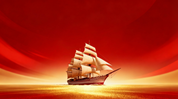 正面视角的大型货轮航行在蔚蓝海面上,船头撞开白色浪花,船身装载着红、黄、蓝、绿彩色集装箱,天空中飘着蓬松白云和飞翔的海鸥,采用扁平化插画风格,色彩明快饱和,线条简洁流畅,海浪呈现规律的波纹纹理,整体画面充满航海的活力与自由氛围。