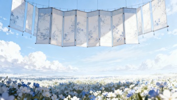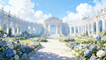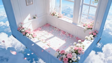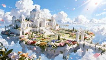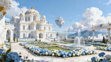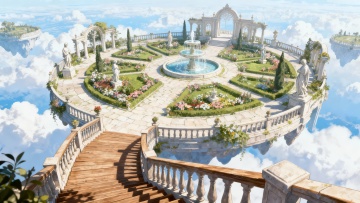 梦幻水彩插画风,喷泉流淌星光粒子,花丛环绕,飞鸟掠过粉紫晚霞,营造浪漫温馨的虚拟自然场景。