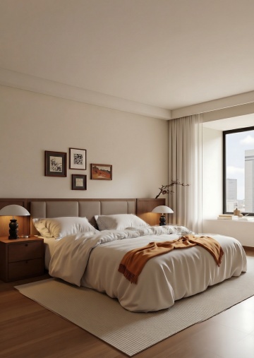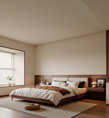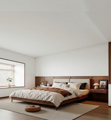 俯视角构图,极简主义风格客厅,整体以冷灰色、深靛蓝和哑光黑为主色调,营造出冷静克制的未来感氛围。傍晚时分,右侧墙面的悬浮式几何窗格精准切割着渐暗的天光,在深灰色微水泥地面投射出规则的菱形阴影图案。房间中央是一个模块化的深靛蓝色布艺转角沙发,表面呈现细腻的纹理褶皱,沙发上随意摆放着两个同色系但不同材质的靠垫——一个光滑如丝,一个粗粝似麻。沙发前是一块超大尺寸的浅灰色羊毛地毯,边缘故意做旧处理,地毯中央悬浮着一个由哑光黑金属框架支撑的透明亚克力茶几,茶几上放置着一个极简线条的黑色陶瓷花瓶,里面插着三支干枯的黑色芦苇。沙发左侧墙角矗立着一盆形态遒劲的琴叶榕,深绿色叶片在冷光下呈现出近乎黑色的剪影,种植在一个带有细微凹痕的手工浇筑混凝土花盆中。沙发背景墙采用了深浅不一的灰色渐变处理,中央悬挂着一幅无框的几何抽象画,画面由精确的黑色直线和大小不一的白色方块构成,画作下方是一个悬浮式的黑色橡木电视柜,表面只放置了一个造型极简的白色音响。天花板采用无主灯设计,而是在不同区域嵌入了可调节角度的线性LED灯带,光线均匀地漫射在整个空间,强调出墙面的微妙肌理和家具的利落线条。地面采用600×600mm的深灰色哑光瓷砖,以30度角错位拼接,缝隙间填充同色系美缝剂,形成整体感极强的视觉平面。整个空间布局遵循"少即是多"的原则,每一件家具都经过精心挑选,线条锐利如刀锋,光影层次分明,呈现出一种冷静而富有力量的空间美学。