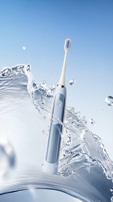 极简蓝调电动牙刷立于雪岛之上,映照冰湖倒影,融合科技感与微缩艺术风,展现清爽未来视觉。