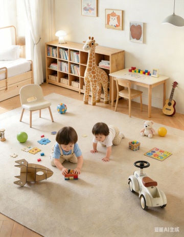 温馨柔和的轻拟物风婴儿房,实木床围搭配柔软面料,萌趣小熊元素点缀,营造出清新自然、舒适可爱的实景感童趣空间。