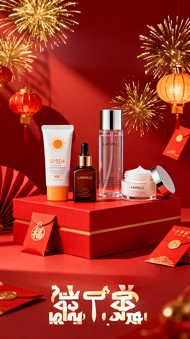 - 展示了四款明星产品: - **防晒霜**(SPF50+):适合新年出行或日常防护。 - **精华液/原液瓶**:深棕色瓶身,滴管设计,高端感十足。 - **爽肤水/化妆水**:透明瓶身,清新简约。 - **面霜/乳霜**:打开盖子,露出丰润质地,强调保湿滋养。 - 产品陈列在红色礼盒之上,营造出“送礼佳品”或“自用犒赏”的感觉,符合春节送礼和自我宠爱的消费心理。 #### 4. **视觉设计亮点** - **主色调为中国红 + 金色烟花**:充满节日喜庆感,吸引眼球。 - **灯笼、烟花、红包元素**:强化春节氛围,增强情感共鸣。 - **光影效果与产品质感**:通过细腻的打光和材质表现,突出产品的高级感和专业度。 比例是9:16详情
