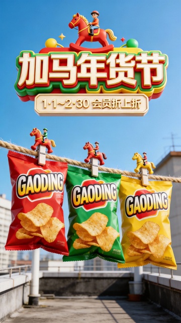 软3D风格萌马拟人化,毛发生长质感,喜庆红灯笼与彩带烘托节日氛围,卡通感十足,趣味对话强化产品脆感体验。