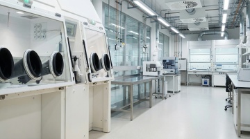 一个干净规整的现代化实验室场景,采用写实风格,以蓝白色调为主,光线明亮柔和,具有清晰的光影层次和细腻的质感表现。画面中可见身着白色防护服的研究人员在先进的白色和蓝色精密仪器设备旁工作,背景是带有规则几何图案的白色墙面。构图采用三分法,空间感强,整体氛围专业、严谨、科技感十足,适合作为背景使用。