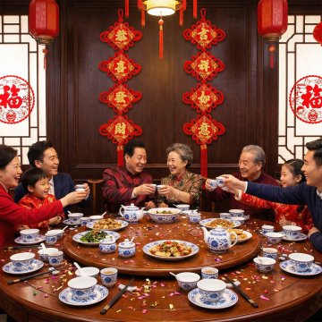 国潮风与重拟物结合,中式庭院实景中,全家围坐圆桌共庆新春,红金刺绣服饰映衬喜庆氛围,油画质感呈现温暖团圆时刻。