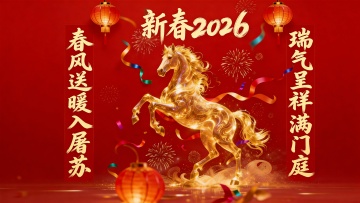 一匹姿态昂扬的骏马,身披红色绸缎,鬃毛和尾巴飘逸,马蹄踏在金色祥云上,周围环绕着红灯笼、中国结和金色烟花,背景是淡红色渐变,整体风格喜庆吉祥,充满新年氛围