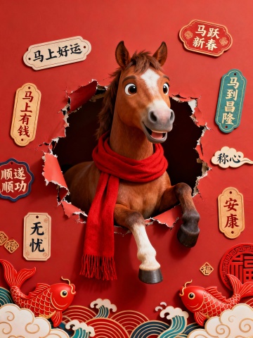 3D拟人马跃破纸而出,红围巾喜庆生动,融合剪纸风与拼贴元素,中式祝福语环绕,营造浓厚春节氛围。