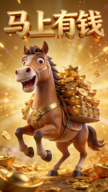 3D拟人马背负金元宝,鎏金金属风十足,喜庆卡通感爆棚,寓意“马上有钱”,节日氛围浓厚。