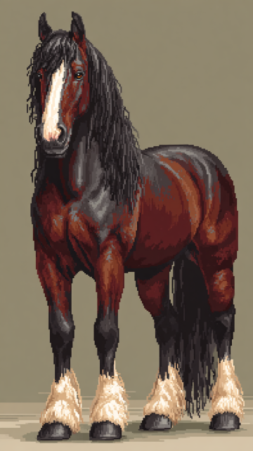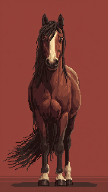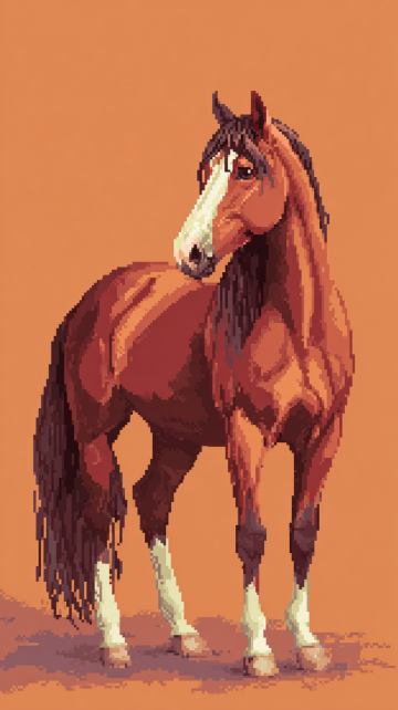 像素风插画,复古色调中展现马匹的体积感与毛发生长细节,写实质感中透出优雅气质。