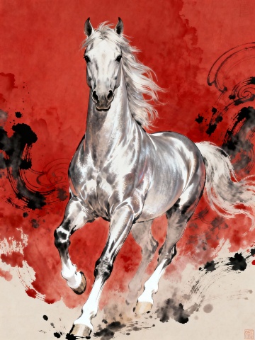 国潮风插画,融合工笔与水墨技法,白骏奔腾于红墨交织的背景,光影与体积感突出,尽显中式古典韵味与民族气魄。