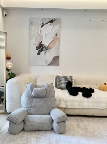 北欧风格室内场景,极简主义设计,明亮通透的客厅,阳光透过白色窗帘洒入,形成柔和的光影效果,浅色木地板,白色墙面带有简约线条装饰,中央是米白色布艺懒人沙发搭配木质支架,左侧有浅米色单人沙发,右侧小边桌上摆放咖啡杯和透明花瓶,背景立柜上放置绿植和装饰品,落地灯发出温暖柔和的光,整体色调以米白、原木色为主,营造出宁静、舒适、自然的居家氛围,高清晰度,真实材质质感,温馨治愈的生活气息。