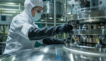 现代化高科技实验室场景,画面干净规整,适合作为背景。明亮的白色与蓝色调为主,洁净的白色墙面镶嵌着深蓝色方块瓷砖,地面为光滑的浅灰色。前景有两位身着全套白色防护服、佩戴护目镜和口罩的科研人员,一位正坐在操作台边专注查看电脑屏幕,另一位站立于大型精密仪器前操作控制面板。实验室中央和后方分布着多台先进的白色与银色相间的分析仪器、设备,带有蓝色显示屏和控制面板,仪器间有金属管道和电缆有序连接。右侧有机械臂装置,左侧前景有透明玻璃容器和绿色植物点缀。整体光线均匀柔和,以冷色调为主,营造出专业、严谨、先进且一尘不染的科研氛围,构图平衡,空间感强,视觉层次分明,信息传达清晰,符合高科技科研环境的审美与功能需求。