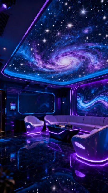 赛博朋克风酒吧,霓虹灯与金属玻璃交织,虚拟现实投影营造未来感空间,酷炫光影映射科技美学。