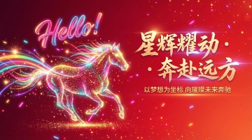 企业2026马年年会主题海报,深邃红色渐变背景,叠加微光粒子效果,左下角有抽象化的奔腾骏马,四蹄踏金色光浪奔腾向前,融入科技感光影线条,极简现代风格,兼具正式感与视觉冲击力,骏马象征企业开拓进取,光浪代表发展势能,红金配色传递庆典喜庆与商业高级感