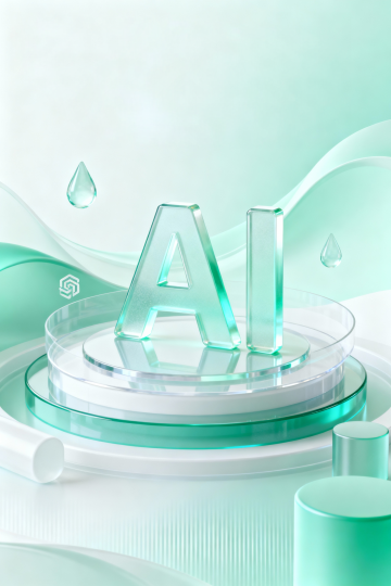 3D立体风格的AI主题插画,以蓝色为主色调,搭配白色和绿色的渐变光影效果,画面中央是由几何块面堆叠而成的立体“AI”字母,字母边缘有发光的绿色线条勾勒,底部是带有网格纹理的透明蓝色平台,周围环绕着悬浮的白色几何碎片和线条,整体呈现出科技感、未来感和数字化的氛围,背景为简洁的白色,光线从上方照射,形成柔和的阴影和高光,营造出轻盈、通透的视觉效果。