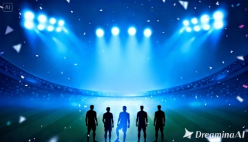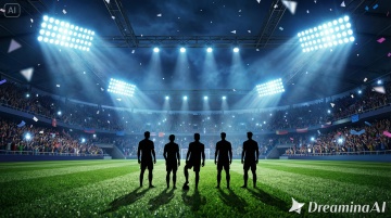 写实风格,高清摄影,特写镜头,一个黑白相间的足球置于前景的绿色足球场上,草叶纹理清晰可见,草尖带有露珠反光,背景是大型圆形露天足球场,观众席坐满观众,球员们在场地中模糊跑动,身着红色球衣,阳光明媚,天空湛蓝,带有少量白云,体育场灯光亮起,光线从斜上方照射,足球表面有高光和阴影,整体氛围充满活力与竞技感,画面层次分明,色彩鲜艳,细节丰富,具有强烈的临场感和真实质感。