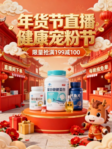 3D轻拟物风格,塑料质感橙汁瓶悬浮于红白渐变背景,搭配年货节灯笼与烟花,营造喜庆促销氛围,底部醒目标注“买1送1”优惠信息。