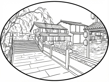 中式古典插画风,清新雅致的庭院景观,石径通幽,绿树成荫。