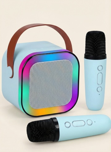 3D风格麦克风图标,白色背景,麦克风主体和底座采用鲜艳的橙红色渐变,金属网罩为亮黄色,支架为天蓝色,整体色彩明快活泼,具有光滑的塑料质感和柔和的高光,圆形底座稳固支撑,麦克风呈45度角倾斜,简洁的卡通化设计,无任何文字和装饰元素。