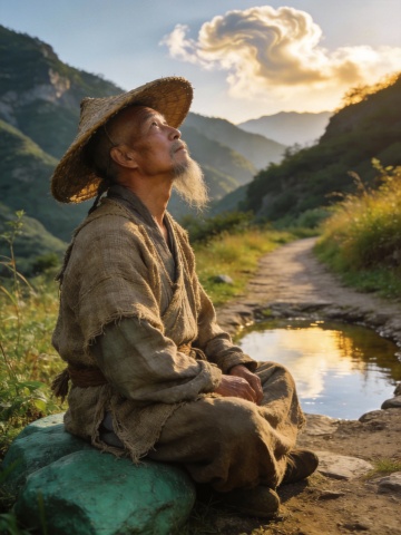 背景是层峦叠嶂的青绿色山脉,山间薄雾缭绕,远处田野呈现柔和的色块,阳光透过枝叶洒下斑驳的光影,整体色调温暖清新,画面充满丰收的治愈感