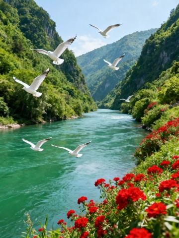 超写实风格的山脉全景图,晨光中的层叠山峦,近处是覆盖着茂密深绿色植被的陡峭山坡,中景为云雾缭绕的墨绿色山谷,山谷间蜿蜒流淌着清澈的河流,远景是渐变为淡蓝色的连绵山脉轮廓,天空中漂浮着白色的积云,整体色调以翠绿、墨绿和湛蓝为主,光线明亮柔和,呈现出宁静悠远的自然氛围,展现不同层次山脉的起伏变化和丰富细节。