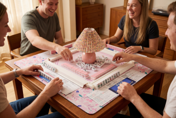 实景感与温馨感交织,自然光影洒落木质餐桌,两人专注对弈,质朴生活气息中透出轻松趣味,轻拟物风设计点缀日常温情。