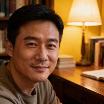 写实风格摄影,画面整体采用柔和的靛蓝色与暖橙色对比色调,一位约四十岁左右的中年男子,身着象牙白传统中式长衫,正专注地在古朴的木质茶桌前进行茶道仪式,他手持茶勺,神情沉静而专注,眼神温和。背景是深色木质博古架,上面整齐摆放着多个靛蓝色与橙色渐变的陶瓷茶罐,左侧悬挂着一盏散发暖橙色光芒的中式纸灯笼,灯笼上有模糊的书法文字。茶桌上摆放着靛蓝色的茶碗、深色陶制茶炉、茶则、茶针等茶道器具,还有一本打开的线装古籍。整体光影柔和,侧逆光勾勒出人物的轮廓,营造出宁静、典雅而略带现代感的氛围,画面构图遵循三分法,人物位于右侧黄金分割点,前景茶具清晰,背景书架稍显虚化,形成自然的景深效果,色彩和谐统一,细节丰富,质感细腻,展现出传统茶道文化的韵味与中年男子沉稳内敛的气质。