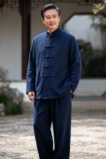 中年男性中式服装形象照,横排纽扣款、全身照、风格休闲。