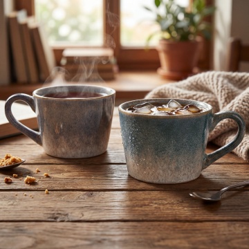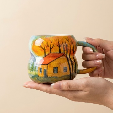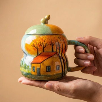 六个不同样式、不同风格、不同配色的陶瓷杯子,每个杯子都具有光滑细腻的釉面质感,如原图中红色杯子般的圆润杯身轮廓和简洁手柄设计,杯子排列整齐呈规则队形,置于纯白色背景上,整体呈现出高清晰度、明亮柔和的光线效果,无阴影干扰,突出每个杯子的独特造型与色彩特点,设计风格简约现代,信息传达清晰直观。