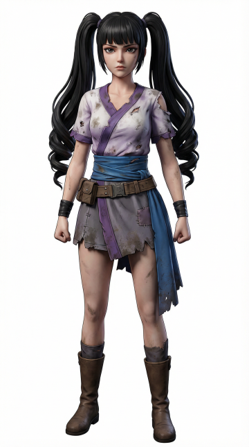 俯视角镜头,在被霓虹灯雨丝切割的赛博都市夜景中,一位半机械化改造的少女悬浮于全息广告牌与空中交通流之间,她拥有及腰的银白色不对称短发,左侧发绺挑染着荧光蓝并编有微型数据管线,右眼镶嵌着猩红光感义眼,面部覆盖着几何形的黑色机械面纹。她身着暗紫色机能风露脐作战服,肩部装配着碳纤维装甲,手臂延伸出可伸缩的纳米刀刃,黑色过膝战术靴底部喷射着淡蓝色反重力气流。周围环绕着全息投影的蓝色数据流与破碎的霓虹符号,背景是层叠的悬浮建筑与穿梭的磁悬浮车辆,雨水中倒映着扭曲的光影与她机械义肢的冷光,色调是赛博紫与电子蓝的强烈碰撞,整体画面充满科技感与未来冷峻美学。