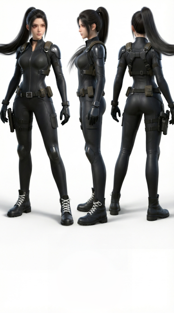 赛博朋克风3D角色,未来感科技金属设计,霓虹灯照亮夜景,展现冷酷与力量。