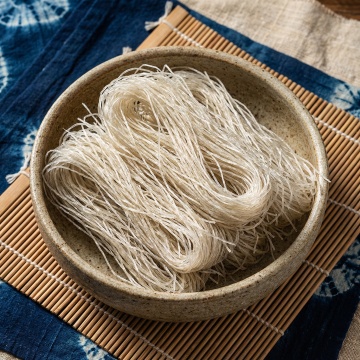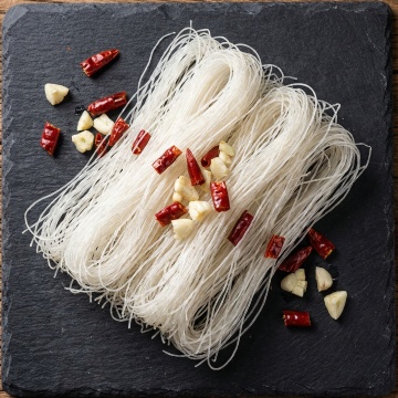 美食摄影风格,特写镜头,一只戴着面粉的手正抓起一把细长的生面条,面条自然垂落,面粉在黑色背景下飞扬,形成动态的白色粉末轨迹,大面积黑色留白背景,突出面条和手部的质感,光线从侧面打来,强调面条的纹理和面粉的颗粒感,画面简洁,主体突出,营造出专业、纯净的烹饪氛围。