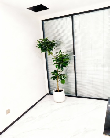 极简主义风格的现代办公室内部,开放式办公布局,浅木色办公桌整齐排列,配备灰色办公椅与黑色电脑显示器,大面积落地窗引入明亮自然光,天花板装有长条形LED白色照明灯管,地面铺设浅灰色地毯,角落摆放绿色大型绿植,整体色调以白色、浅木色、灰色为主,呈现简洁、专业、通透的氛围,不同环境角度下的办公室背景,保持相同的极简现代风格与色彩搭配。