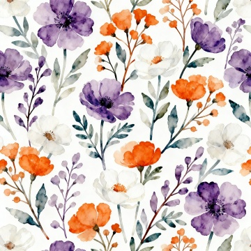 水彩风格花卉装饰元素,白色背景,五组不同形态的花卉组合,整体呈现清新自然的手绘质感,色彩过渡柔和透明,带有水彩特有的晕染效果和细微的笔触纹理。花卉包括玫瑰、向日葵、绣球花、百合等,花瓣层次丰富,细节精致,搭配深绿色和蓝绿色的各式叶片、藤蔓,整体构图平衡和谐。主体花卉颜色调整为:上方第一组以淡紫色玫瑰、鹅黄色向日葵和白色小花为主;中间第二组为浅粉色玫瑰、淡蓝色绣球花和橙色玫瑰;第三组为枚红色大丽花、白色小花和黄色花蕊点缀;下方左侧一组为深粉色玫瑰、橙色小花和黄色向日葵;最下方一组为浅粉色玫瑰、白色百合和粉色小雏菊,所有花卉保持原有的形态结构和水彩质感,色彩明亮柔和,与绿色枝叶形成鲜明对比,整体画面清新雅致,适合作为装饰元素使用。