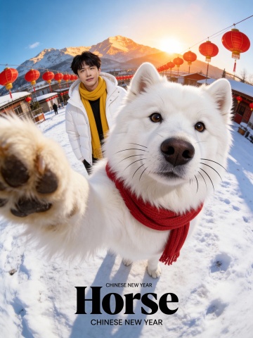 拟人风猫咪戴红围巾虔诚祈福,毛发生长质感路牌叠满新年祝福,面料风雪景烘托喜庆温馨氛围,窗外烟花绽放迎接2026。