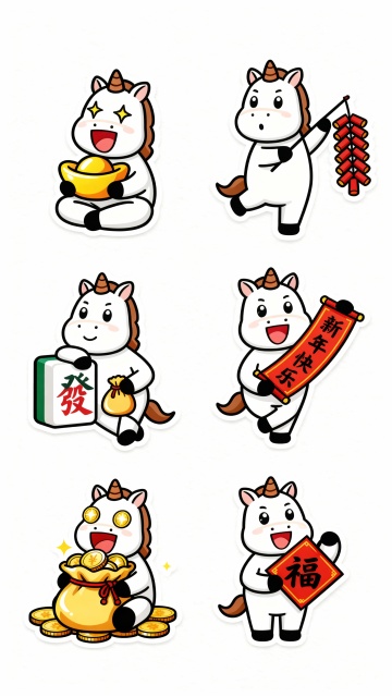 可爱卡通小马拟人化设计,扁平插画风,融合剪纸元素,手持福字、灯笼与红包,喜庆新春氛围浓厚。