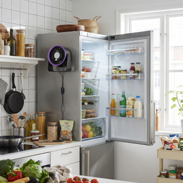 现代简约风格的银色双门海尔冰箱,位于宽敞明亮的乡村厨房内,白色墙面搭配原木色橱柜,窗外是绿色田野和远山,自然光透过大窗户洒入,地板为浅色实木,冰箱旁有一盆绿色植物和木质小推车,整体色调清新自然,光影柔和,营造出温馨舒适的居家氛围,高清晰度,写实摄影质感。
