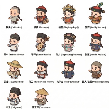可爱感与卡通感结合,扁平风插画呈现国潮风中式角色,拟人化演绎清代人物群像,复古感十足,展现传统文化魅力。