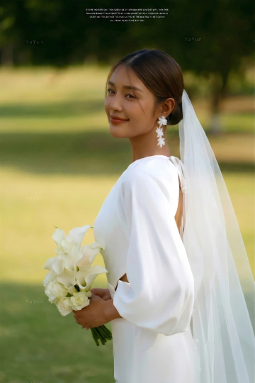 一对新婚夫妇的亲密特写,新娘身着白色蕾丝鱼尾婚纱,头戴带蕾丝花边的白色头纱,手持白色玫瑰花束,棕色长卷发自然垂落;新郎穿着黑色西装,内搭白色衬衫,系黑色领结,胸前佩戴白色胸花,两人面带微笑,额头相抵,眼神充满爱意和幸福。采用柔和的自然光摄影风格,温暖的金色光线从侧上方照射,形成细腻的阴影和柔和的高光,背景虚化处理,突出主体人物的情感互动和清晰的细节质感,整体画面呈现出浪漫、温馨、高雅的氛围。
