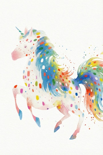 卡通风格的独角兽,彩虹鬃毛与彩色糖果环绕,蜡笔质感搭配拼贴元素,充满童趣与甜蜜感,波普艺术风格点缀节日欢愉氛围。