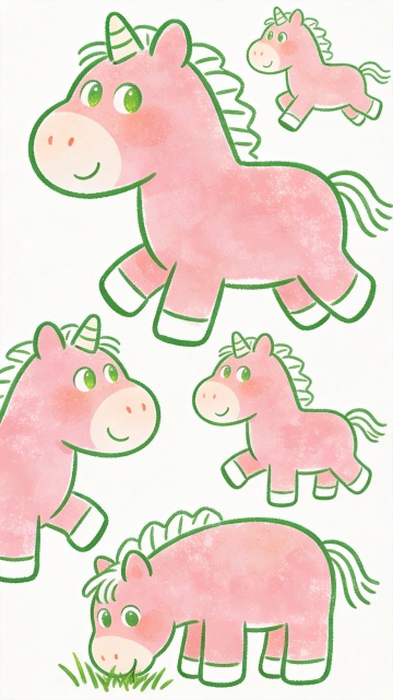 灵魂画手,简笔手绘线稿,绘本简约,绿色色线勾勒,有食欲,抽象,艺术,高级,大写意,极简风格,几只卡通可爱小马,矢量弥散,完美线条,粉色为主色调,磨砂肌理,朦胧感,非写实,色彩饱满,笔触细腻,手稿,大师杰作,白色背景