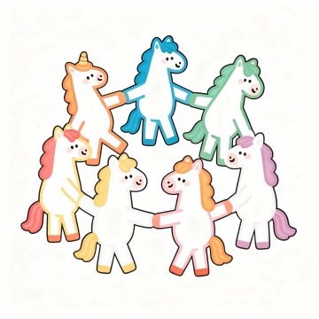 可爱感十足的卡通马围圈牵手,寓意”house连连“插画风结合描边与拟人设计,色彩梦幻,充满童趣与节日欢乐氛围。
