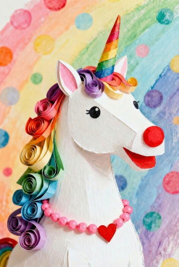 梦幻感十足的撕纸风独角兽,彩虹卷发与波普色彩背景交织,搭配可爱心形项链,充满童趣与甜蜜气息。