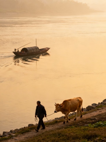 实景感中式古典建筑,city pop风光影交错,宽阔水面映衬浪漫夕阳,印象画派水彩风唯美景致。